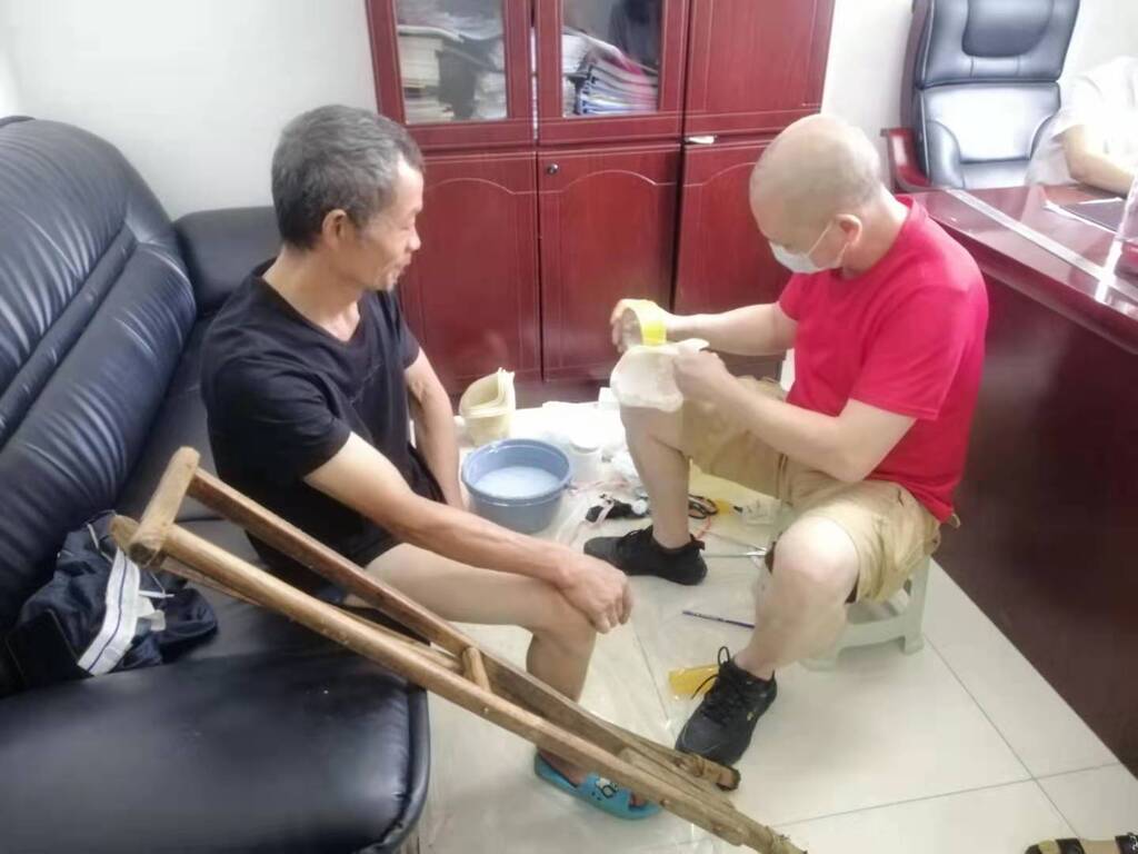 在适配活动现场,专业适配人员仔细检查并现场测量每位肢体残疾人员的截肢部位和伤残程度,然后用石膏进行现场取模,下一步,假肢生产厂家将根据现场取模的具体情况,一对一进行假肢制作、试穿和调试。取模过程中,工作人员还用通俗易懂的语言为他们讲解假肢保养与维护方面的知识,确保残疾群众听得懂保养知识、用得来假肢,并尽可能通过自身保养延长假肢使用年限。