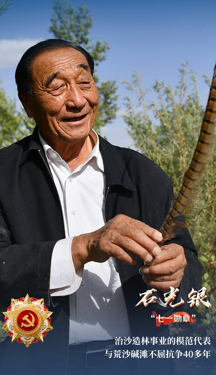 “石光银,治沙造林事业的模范代表,40多年坚持与荒沙碱滩不屈抗争,创造治沙与致富相结合的新模式,为彻底改变毛乌素沙漠南缘‘沙进人退’恶劣环境作出杰出贡献。”这简短的出场介绍,让更多的人记住了这副宽厚的肩膀扛起来的不凡事业,也为“治沙人”的故事写下梗概。