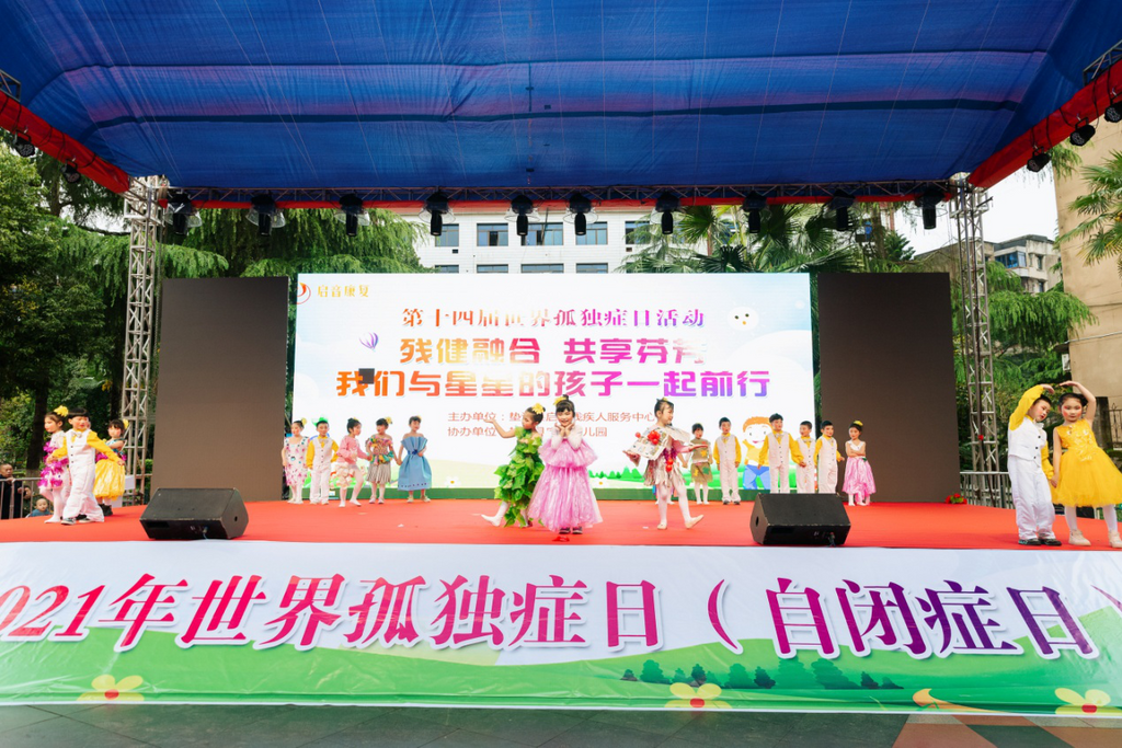 “让我们的笑容充满着青春的骄傲,让我们期待明天会更好……”伴随着甜美的歌声,一群可爱的“蓝精灵”正在舞台上尽情“飞舞”着。3月31日,“残健融合 共享芬芳——我们与星星的孩子一起前行”垫江县第十四界世界孤独症日(自闭症日)活动在垫江中心广场举行。来自垫江县康乐幼儿园的24名小朋友们和启音残疾人康复中心的19名自闭症儿童通过唱歌、跳舞、做游戏,为大家带来了一场精彩的表演。