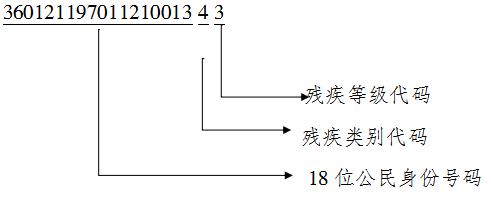 第五条 残疾人证号全国统一编码,首次办证采用20位编码格式,以公民身份号码和残疾类别、残疾等级代码为基础,由18位公民身份号码加1位残疾类别代码和1位残疾等级代码组成,如: