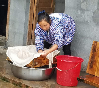 师父郭全英手把手地教石小菊制作豆腐。泡豆子、磨豆子、摇豆汁、煮豆汁、豆渣上箱、压箱、开箱……石小菊制作豆腐,丈夫李明富就为她打下手。“用冷水泡豆子会慢点,用热水泡豆子会快点。石膏的生熟、量的多少、何时下膏才有品质和口感。”一次又一次的重复,一次又一次的摸索。