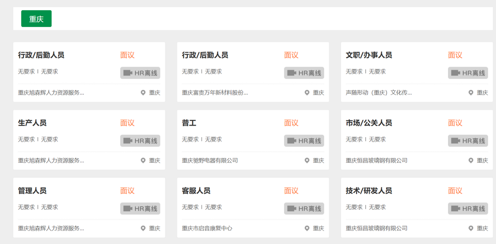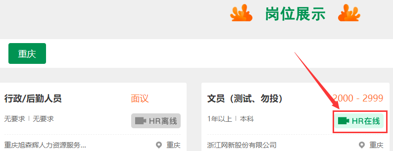 也可以在招聘会主会场查看到“HR在线”时直接向该用人单位HR发起视频交流,进行实时的视频求职互动。如下图:需注意:如显示“hr占线”则表示企业正在与其他面试者面试中,或显示“hr离线”则表示企业未登录无法与企业进行视频面试;