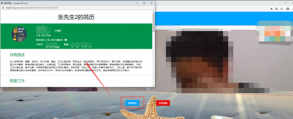 视频接通后,可在线与残疾人求职者进行视频交流。特别提示:面试过程中,可点击“查看简历”了解求职者基本情况,面试结束后,请点击“关闭视频”按钮。