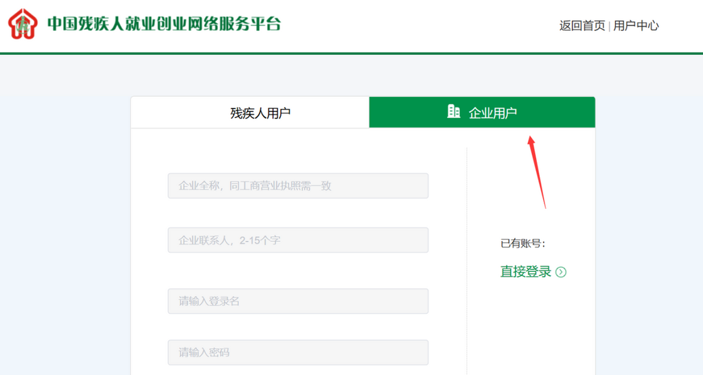 用人单位通过电脑或手机端进入中国残疾人就业创业网络服务平台首页,点击页面右上侧的“免费注册”,进入用户注册页面,选择“企业用户”,按要求填写信息,完成注册,如下图: