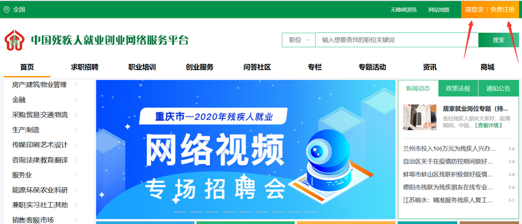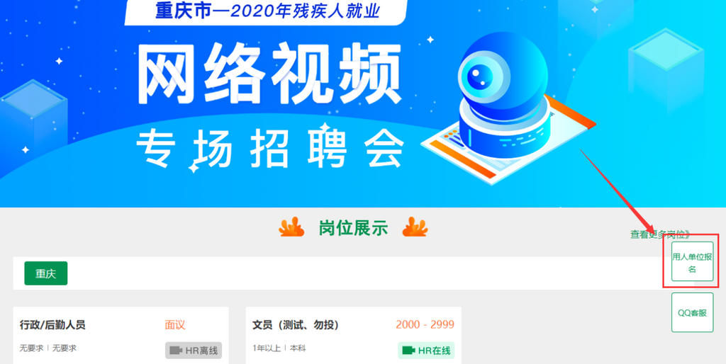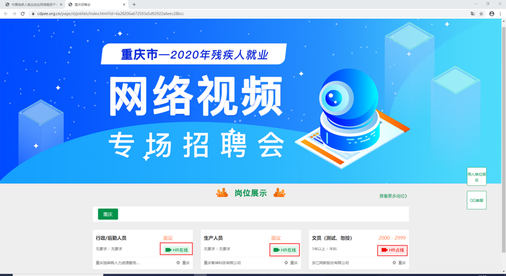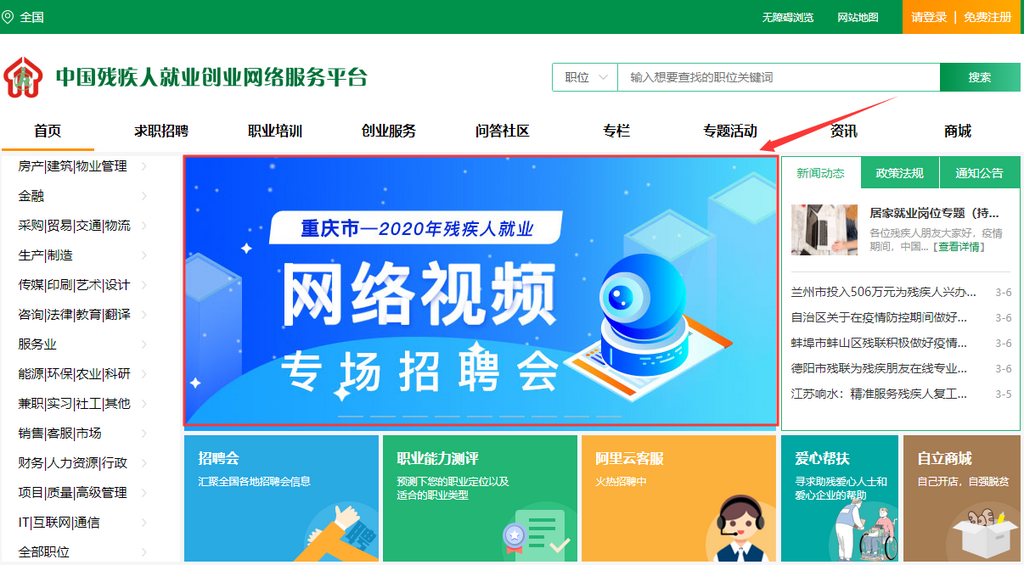 第二步:在中国残疾人就业创业网络服务平台首页广告栏找到“重庆市2020年残疾人就业网络视频专场招聘会”点击进入即可参会。