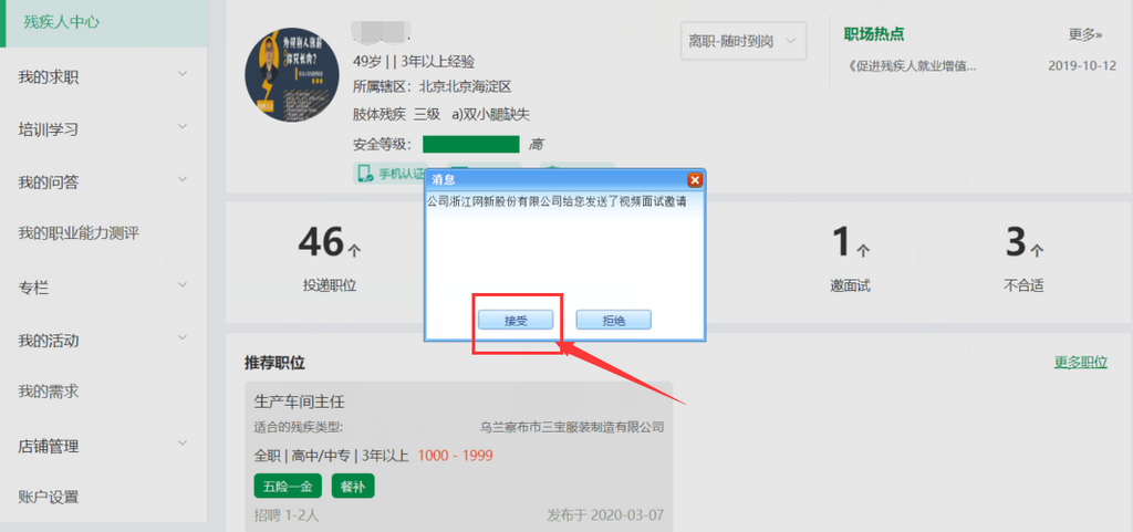 残疾人求职者在登录账号状态下,如有弹窗弹出某企业向您发送视频面试邀请,可点击“接受”按钮与在线企业HR进行远程视频面试交流;