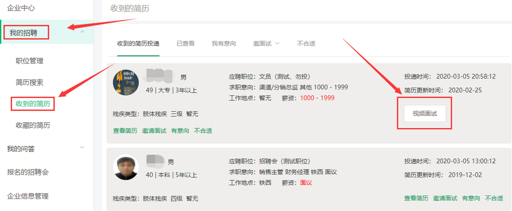 企业可以主动邀请残疾人面试。进入企业用户中心,在“收到的简历”中查看简历信息,点击页面中“视频面试”,可向在线残疾人求职者主动发起视频招聘交流,如下图: