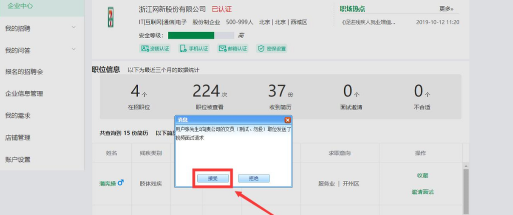 企业在登录账号状态下,如有弹窗弹出某求职者向您发送视频邀请,可点击“接受”按钮与在线残疾人求职者进行视频招聘求职交流,如下图:
