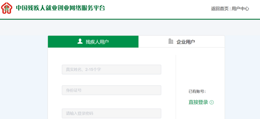 残疾人求职者进入中国残疾人就业创业网络服务平台首页,点击页面右上侧的“免费注册”,进入用户注册页面,选择“残疾人用户”,按要求填写信息,完成注册,如下图;