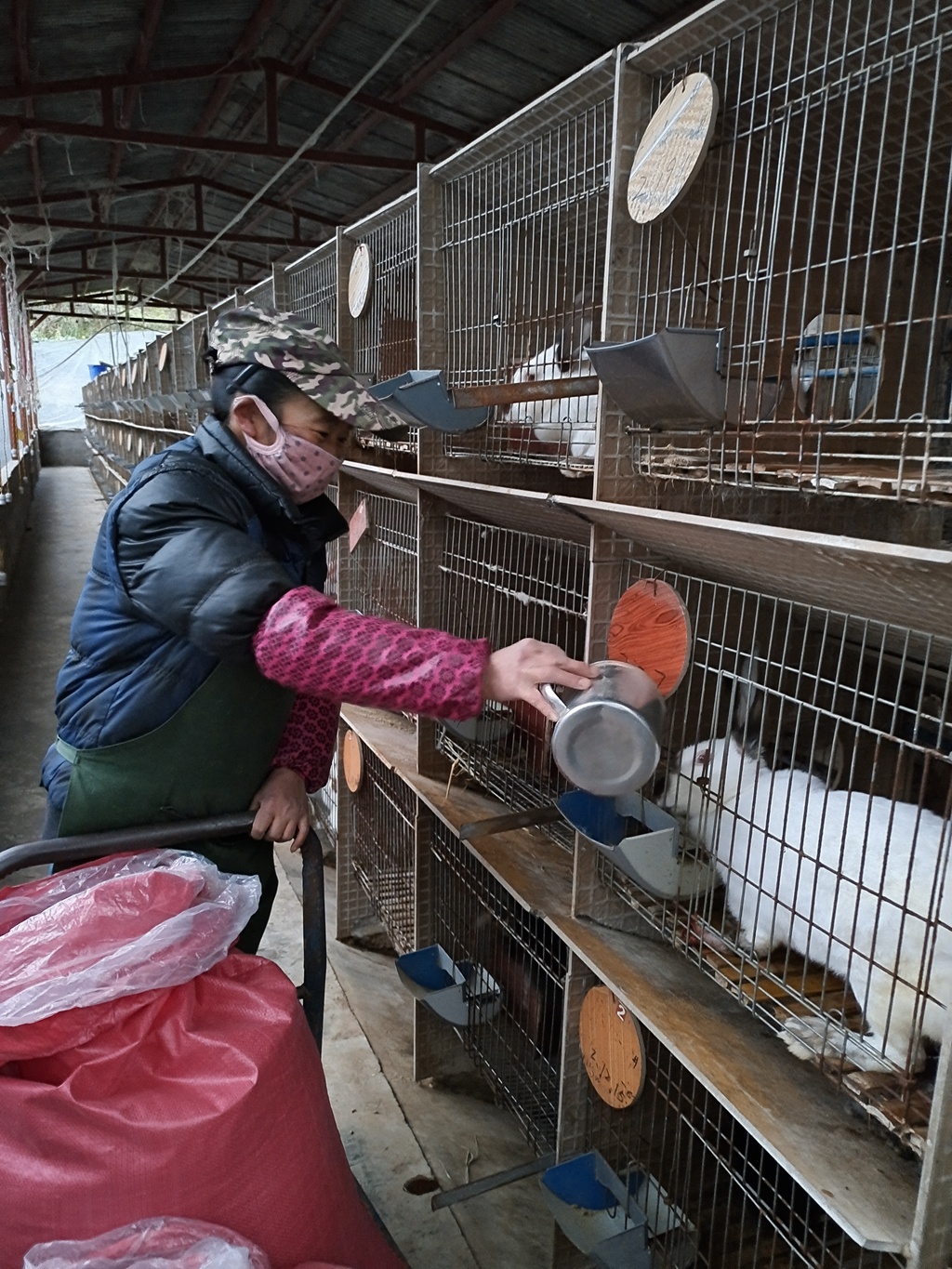 娄作梁养殖场的员工正在给肉兔喂食
