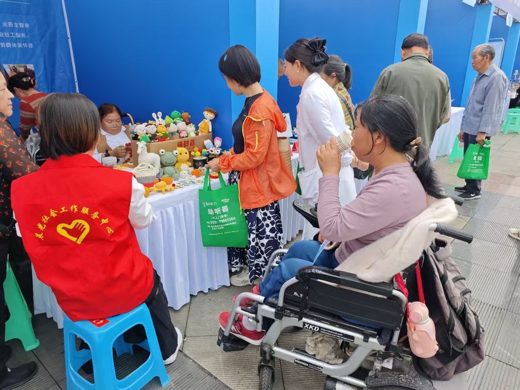 在政策宣传区,工作人员通过发放宣传册现场咨询等方式将残疾人康复救助、托养服务、补贴发放等惠残助残政策送到市民手中。文创展区有文创香包、手工串珠等残疾人手工制品;义诊区内有专业的医生为群众进行眼睛、耳朵的诊治。