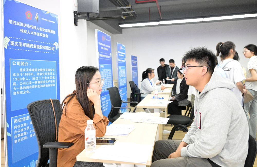 4月15日,第四届重庆市残疾人创业成果展暨残疾人大学生双选会在市残疾人创业孵化基地举行。本次活动由市残疾人劳动就业服务指导中心主办,市残疾人创业孵化基地承办,吸引34家企业参展,25家用人单位提供各领域岗位70余个,现场达成就业意向60余人,参展规模与签约人数均刷新历届纪录。