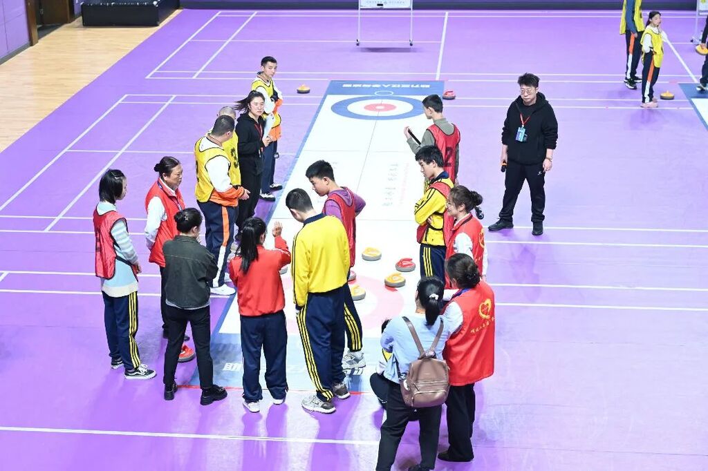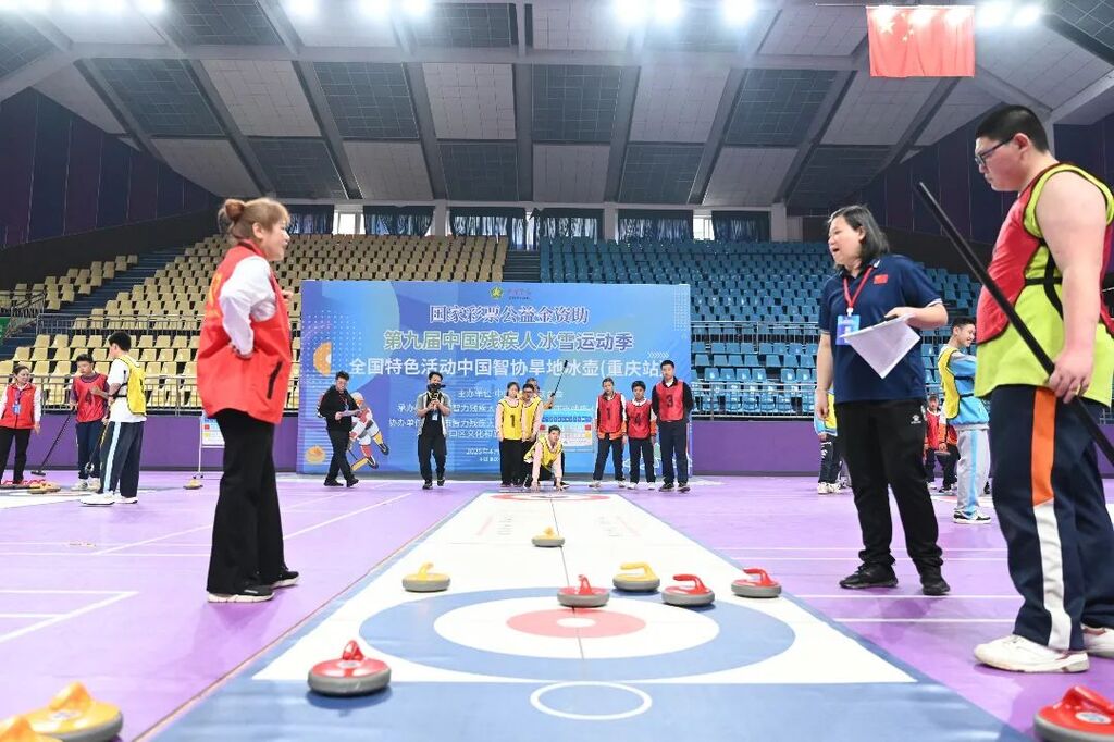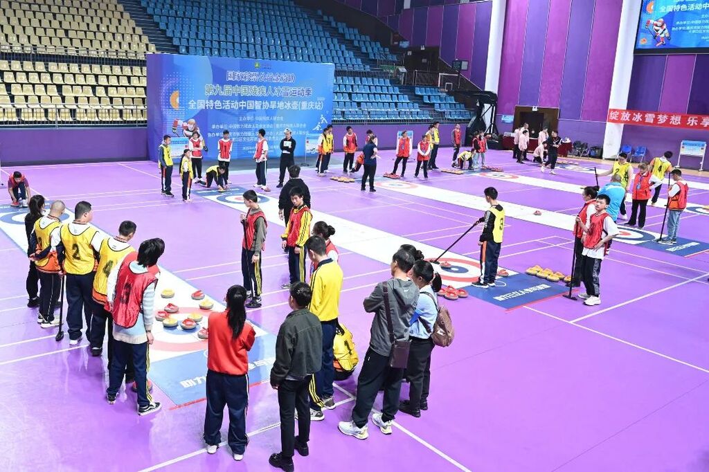 为进一步推动残疾人冰雪运动发展,展现智力残疾人乐观向上、奋勇拼搏的精神风貌,4月8日,第九届中国残疾人冰雪运动季中国智协旱地冰壶(重庆站)比赛在大渡口区体育馆举办,来自重庆市智力残疾人运动员、部分亲友、教练、志愿者等130余人参加比赛。
