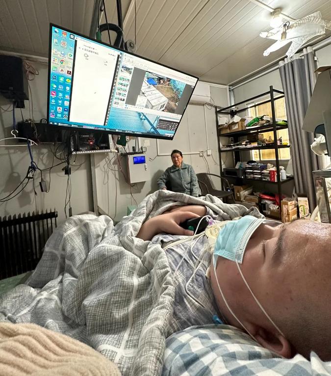 被各种医疗仪器包围着、躺在病床上的黎夏左手食指控制鼠标滚轮,右脚二脚趾头完成点击,通过调节摄像头角度和清晰度,观察着大棚内的机器运转。