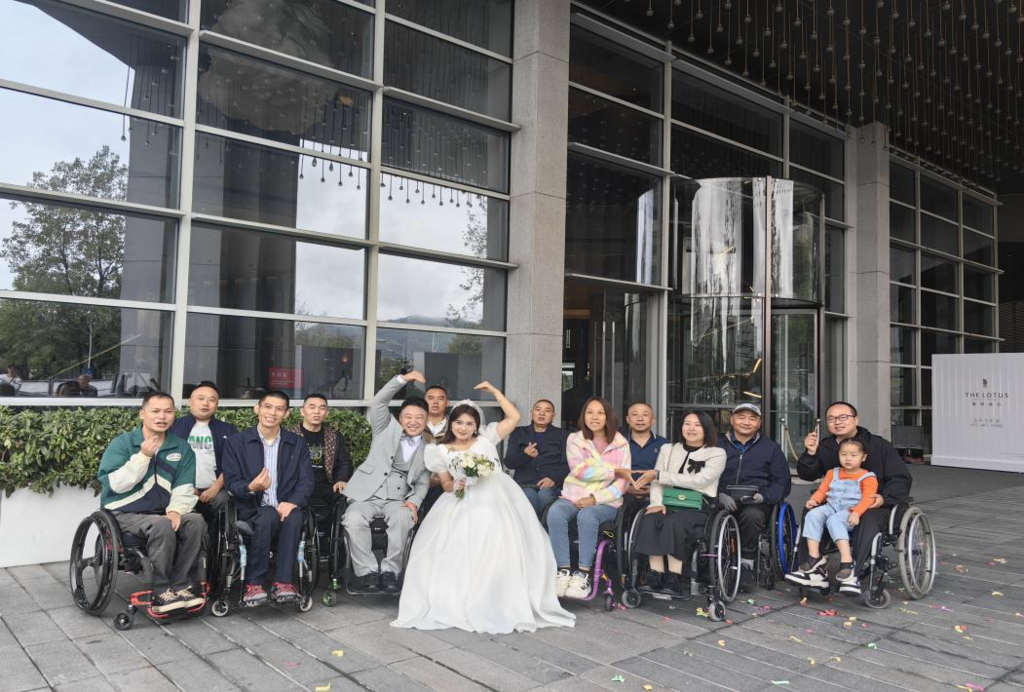 午休时,周仁强开始翻看微信。他的微信好友不多,除了亲朋,就主要是轮友。刷到轮友屈丽娟的朋友圈,他的眼睛突然发亮。一组喜庆的婚礼照片,让他羡慕不已。把每一张照片都放大仔细看完,周仁强的脸上笑容不断:“我们一起去参加轮椅赛的两个人结婚了。真的没想到,他们回来(10月)20号就办酒了。”