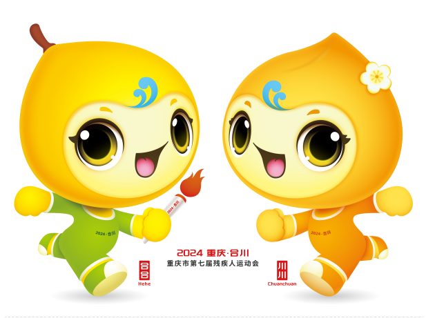 重庆合川有“中国枇杷之乡”和“中国黄桃之乡”的美誉,市七届残运会吉祥物以重庆合川特产“枇杷”和“黄桃”为设计原型,并融入“水纹”等设计元素,形成“健康快乐、和谐美好”的卡通形象,充满浓郁的地域特色、深厚的文化底蕴以及人文精神,展现出残疾人自强不息、顽强拼搏的精神风貌,彰显出“更快、更高、更强、更团结”的奥林匹克精神。吉祥物取名为“合合、川川”,“合合、川川”身着运动装,合合手拿火炬,和川川一起作出奔跑的姿势,欢迎海内外来宾莅临合川,感受市七届残运动会魅力。