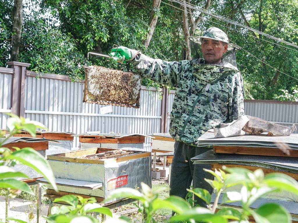 “全部都是柚子花蜜,品质好,能卖个好价钱。”5月5日,在张荣的蜜蜂养殖场,一排排蜂箱整齐地摆放在架子上,旁边一株株柚子树还残留着清甜的花香。